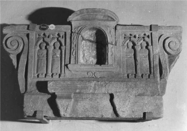 Il rilievo presenta, al centro, un piccolo tabernacolo ad arco a tutto sesto ornato da due corone floreali e sormontato da un timpano, lateralmente, entro nicchie, si trovano due personaggi per lato, a figura intera e con le mani giunte, parte finale decorata con girali.