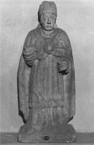 Statua a tutto tondo, basamento marmoreo inciso, raffigura il Santo vescovo Claudio a figura intera, lo sguardo fisso, stante e abbigliato con mitra e piviale chiuso da un grande fermaglio rotondo, pianeta e tunichella, privo della mano destra.