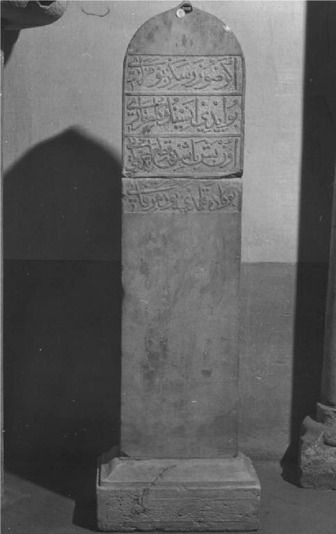 Stele funeraria scolpita nella parte superiore, ad andamento curvilineo, con scrittura cufica, liscia nella parte inferiore, poggiante su alto e semplice basamento di pietra di forma rettangolare