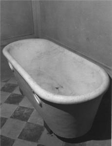 Semplice vasca da bagno in un unico blocco di marmo bianco leggermente venato di grigio, bordo modanato, due anelli di marmo sulla facciata anteriore imitanti due maniglie, priva di piedi, un foro all'interno fatto prababilmente in epoca recente.