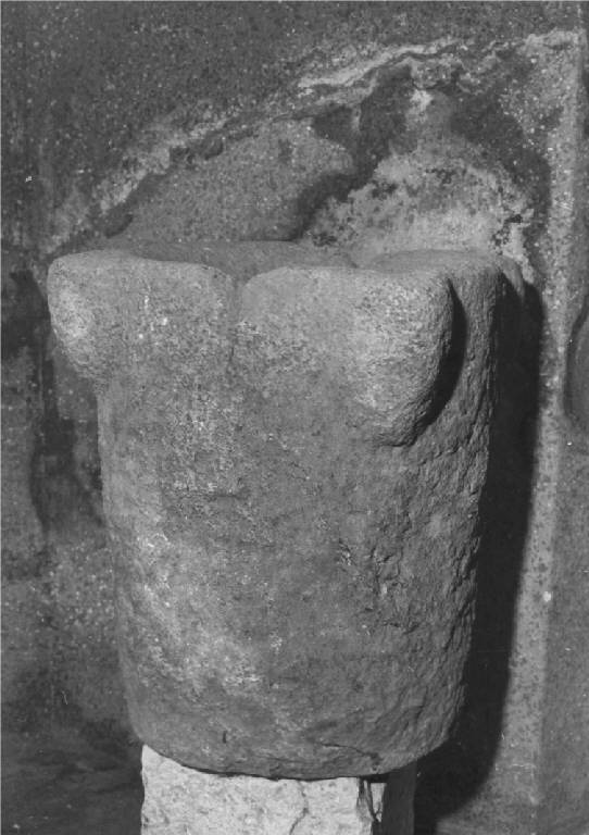 Mortaio con struttura molto allungata e martellata, decorato sul bordo con quattro elementi arrotondati e sporgenti che delimitano gli angoli.