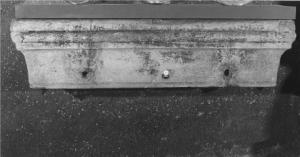 Lavabo a muro di forma rettangolare con tre mascheroni imitanti teste di legno a cui dovrebbero essere applicati i rubinetti; bordo liscio con doppia modanatura.