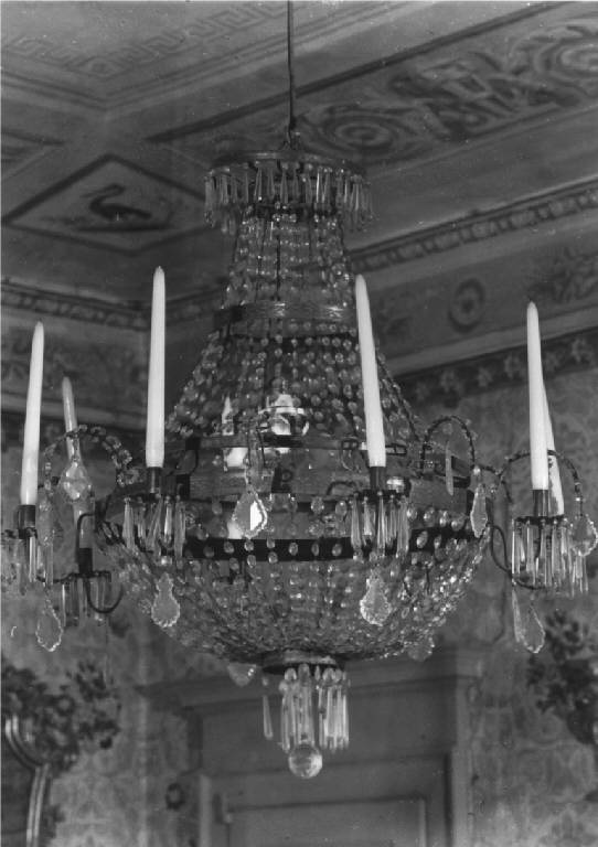 - NOTIZIE STORICO CRITICHE Tardo è l'uso dei lampadari a soffitto nelle case private. Murano, che aveva dettato legge per tutto il XVIII secolo, a un certo momento risente di influssi d'oltralpe, dapprima boemi, poi francesi. Si mescolano così la tradizione del vetro fino con il metallo, ottone o bronzo dorato. Alla fine del secolo decade la vecchia tradizione muranese e la struttura si adegua a quella d'oltralpe, soprattutto boema, della foggia a corona o a pallone gonfiato, mentre gli elementi costruttivi sono ancora di vetro veneziano. Per confronti si vedano esemplari stilisticamente molto simili conservati in una collezione veneziana a Roma, a Venezia, Palazzo Albrizzi, a Stra, Villa Nazionale, nonchè quello di più imponenti proporzioni della Reggia di Caserta e di Villa Mansi a Segramino (Mariacher, 1981, 2° ed., pp. 93, 107, 108, 121)