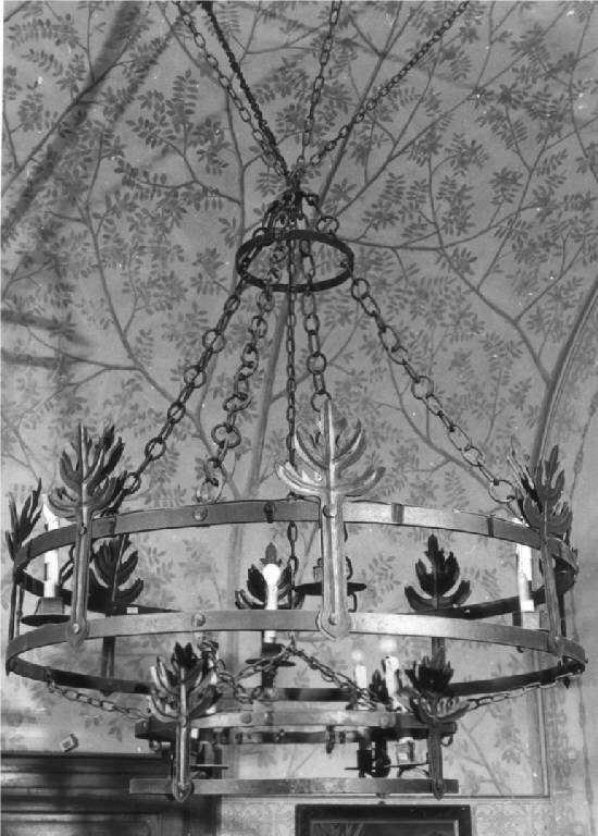 Lampadario da soffitto, a otto luci, presenta una forma a corona con due strutture lisce e rigide; la superiore decorata con foglie stilizzate applicate con borchie metalliche, quella inferiore è di minori dimensioni, applicato al soffitto con grosse catene.