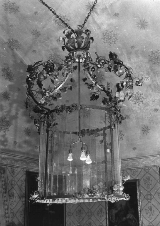 Lampadario da soffitto, grandi proporzioni a struttura circolare con vetri suddivisi in lastre strette e lisce, arricchito da grandi racemi coperti di rose e foglie riprese in minor misura sui bordi della struttura portante, è appeso al soffitto con un gancio nascosto da foglie ricurve a calice.