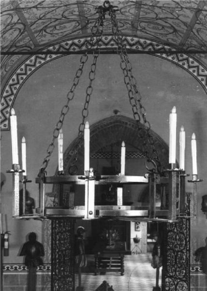 Lampadario a soffitto, a otto luci, strutture lisce, portacandele diritti sostenuti da mensoletta semplice, ciascuna luce è applicata al corpo centrale tramite una sbarra di ferro con due grosse borchie, attaccato al soffitto con catena a quattro bracci.