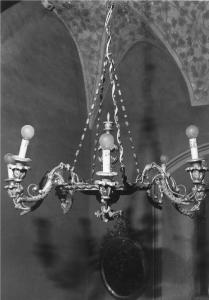 Il lampadario, a soffitto, presenta otto luci, una base circolare a cui sono applicati bracci curvilinei a motivi ramiformi terminanti in boccioli portacandele, applicato al soffitto con quattro catene ornate con perle alternate a cilindretti.