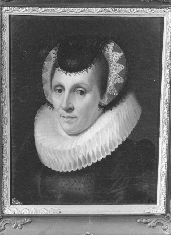 Gentildonna a mezzo busto, d'età matura ed in atteggiamento pensoso, ampia veste di velluto nero, al collo ampia gorgiera bianca, sul capo porta una rigida cuffia ornata di pizzo bianco delle Fiandre su cui poggia una ciocca di capelli trattenuti da merletto nero, fondo scuro; cornice con decorazioni dorate, non pertinente.