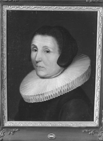 Il dipinto ritrae una gentildonna di età matura, a mezzo busto; lo sguardo è triste, la è veste nera, come la cuffia, al collo porta un' ampia gorgiera bianca, fondo scuro; cornice con decorazioni dorate, non pertinente.