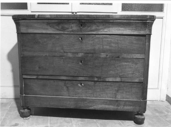 Cassettone a quattro cassetti, il superiore di più piccole dimensioni, piedi anteriori torniti, piano liscio e leggermente aggettante, fianchi diritti.