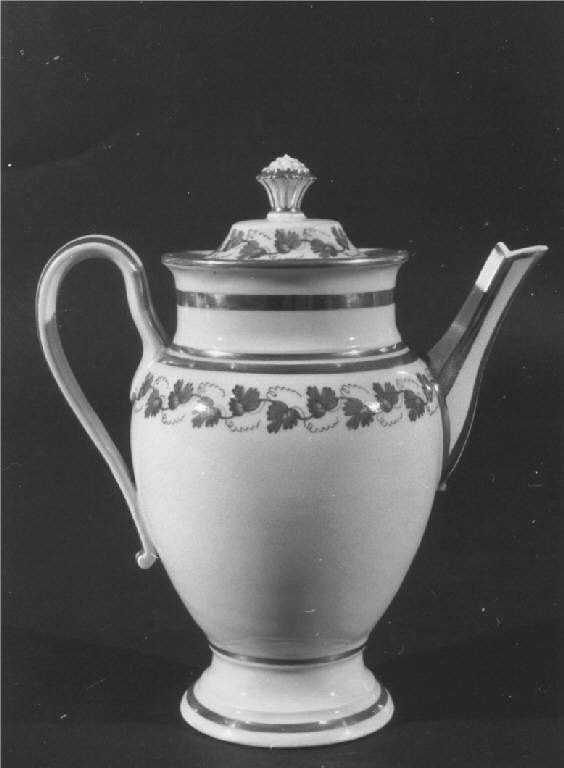 Caffettiera con coperchio, in porcellana bianca decorata a terzo fuoco in oro zecchino, piede circolare con bordo sollevato e larga profilatura ripresa alla base del corpo, rigonfia nella base superiore, decorata a mano con bordo continuo di foglie di vite, ripreso sul coperchio schiacciato con presa a pigna dorata, alto collo, manici a voluta allungata, beccuccio sagomato, entrambi con grandi profilature in oro zecchino.