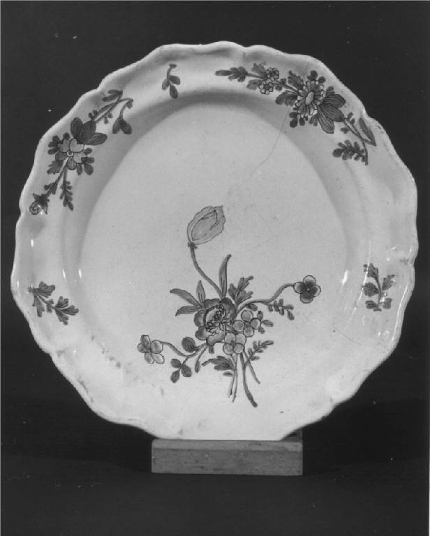 Piatto con tesa baccellata e sagomata, orlo rialzato decorato a gran fuoco in policromia, decorazione con mazzo di fiori in giallo ocra, arancio, blu e verde marcio sul cavetto e due mazzolini alternati a rametti verdi sulla tesa.