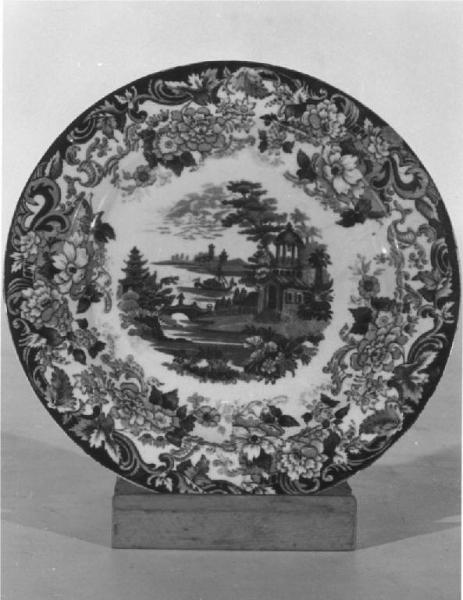 Piatto decorato con decalcomania blu sottosmalto, ricca bordatura con fiori, fogliame e volute che traboccano dalla tesa sul cavetto, ornato con paesaggio lacustre di tipo orientale, con pagode, ponticelli, alberi e due personaggi.