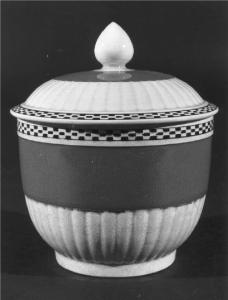Zuccheriera di maiolica color crema dipinta sottosmalto, con piede, ornata con motivo baccellato nel corpo inferiore bianco con "craquelure", ripreso sul coperchio rigonfio, decorata nella parte superiore con fascia color mattone ripetuto alla base del coperchio con presa a cuore, bordi esterni ornati con motivo decorativo a piccoli scacchi bianchi e neri.