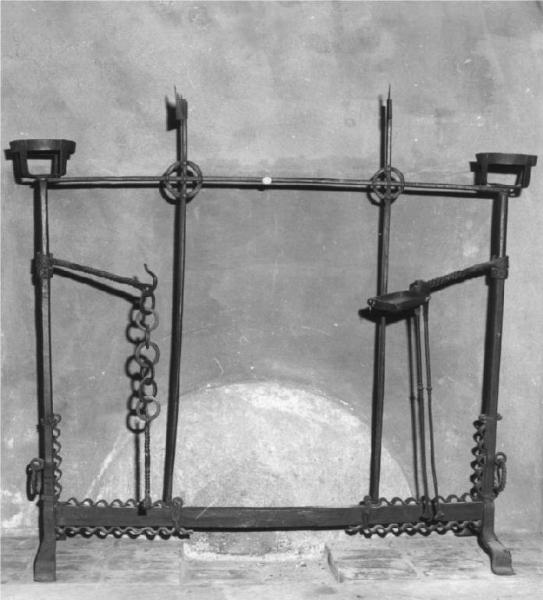 Servizio da camino costituito da spiedo al centro, reggimolle e sui sostegni laterali poggianti su piedi due portatores.