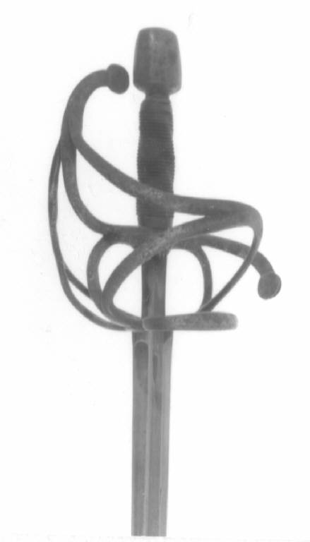 Pomo a barilotto a dieci facce con basetta, impugnatura a fuso, camicia di treccioline e filetti con rigrossi destrogiri tra ghiere, elso a gabbia in tondino schiacciato con crociera a scudetto, braccio di parta rivolto in basso, guardia con ramo di raccordo al ponte obliquo, contragguardia di due rami, archetti e due ponti, braccio e guardia sono finiti a dischetto, lama non pertinente a due fili scanalata al forte, con tallone a forte rincasso.