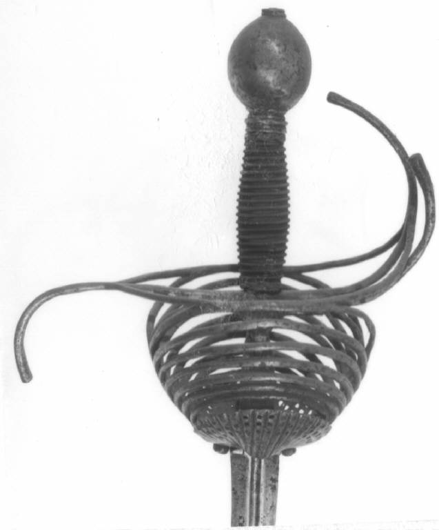 - NOTIZIE STORICO CRITICHE Spada di tipo ibrido, da un lato erede e sviluppo della spada "a tre ponti" (cfr. De Vita, 1983, p. 15 e tav. 21D), dall'altro caratterizzata dalla conchiglia (sostitutiva del ponticello) tipica della spada "alla vallona" (che è però arma da cavallo). Il tipo è abbastanza comune in area europea, anche se ebbe verosimilmente breve durata venendo sostituita dalla più protettiva spada "alla spagnola": in Italia se ne segnalano esemplari nel Museo di Arezzo (inv. 1974.133), al Museo Stibbert (cat. 303 ss.) etc. C'è una marca, nella scanalatura a forte