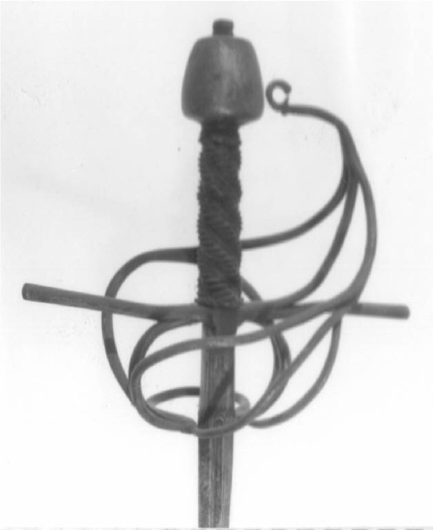 - NOTIZIE STORICO CRITICHE Il fornimento è riconducibile a una tipologia intermedia tra quella detta "a tre vie" e quella "a due ponti", databile agli inizi del Seicento. La tipologia diffusa non permette di specificare meglio l'area di produzione. La lama, di tipo spagnolo, potrebbe essere un'imitazione di area italiana per la marca al ricasso. Vi sono due marche, una al ricasso, ed una nella scanalatura