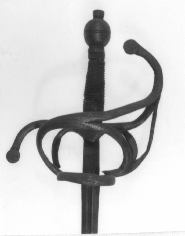 Pomo sferoide con bottone quadro e basetta, impugnatura a fuso con camicia di filo ritorto tra ghiere, elso a gabbia in tondino schiacciato con crociera a scudetto; braccio di parata volto in basso, guardia con ramo di raccordo al ponte obliquo, contragguardia di uno dei due rami archetti (fratturati) e ponticello, braccio e guardia sono finiti a dischetto, lama a due fili, scanalata al forte poi a sezione circolare, con tallone sodo scantonato.