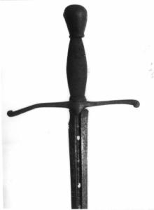 - NOTIZIE STORICO CRITICHE Spada ricomposta nel secolo scorso con pezzi non pertinenti; pomo ottocentesco. La lama presenta un incavo al tallone per facilitare la presa, è priva di ricasso per adattamento posteriore. La marca della croce doppiamente uncinata si trova anche sulla spada 257 dell'armeria, firmata da uno Scacchi di Gromo. Ci sono due iscrizioni al medio: marca della croce doppiamente uncinata al braccio superiore e piccolo orbe crociato