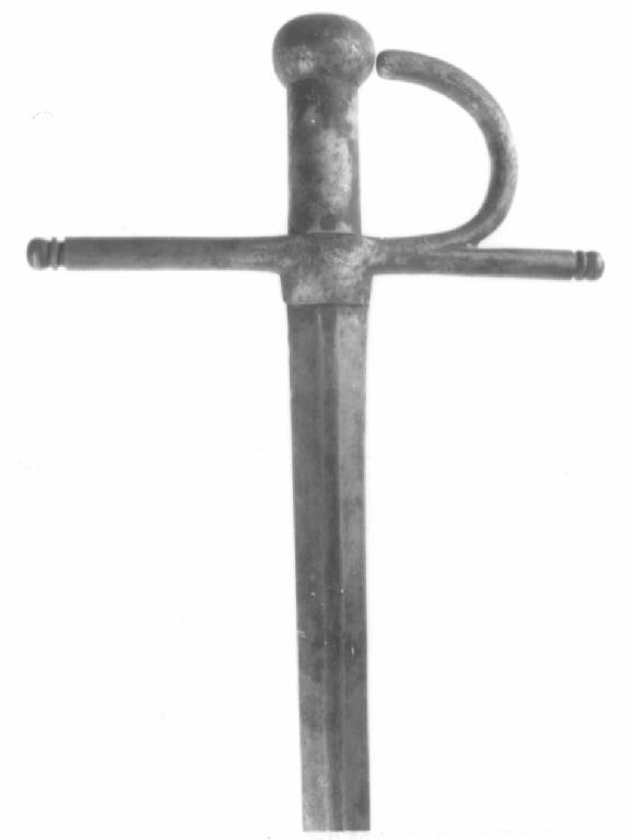 Fornimento di un solo pezzo di acciaio gettato e rifinito a intaglio, pomo sferoidale schiacciato ai poli, impugnatura cilindrica, blocchetto rettangolare dal quale si diparte, dall'elso, in due bracci orizzontali in tondino terminanti con cornicetta e rigrosso dal quale si diparte la guardia in tondino che sale a semicerchio quasi a saldarsi al pomo, lama a sezione esagonale per tutta la lunghezza e priva di tallone.