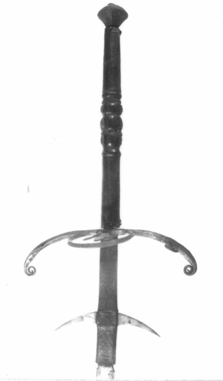 - NOTIZIE STORICO CRITICHE Spadona di tipo tedesco per la conformazione dell'elso a bracci ricurvi e arricciolati. Tutti gli elementi stilistici, pomo, balaustro, bracci e anelli, sono molto simili a quelli usati dall'armaiolo bavarese Wolfgang Stantler, così come appaiono nella spadona a due mani cat. 264 del Museo Stibbert di Firenze, tanto da poter ritenere anche questa spada un prodotto della sua bottega. La lama con il globo crociato è di produzione tedesca (Solingen?). ASl forte globo crociato coi bracci biforcati, e marca su un becco di falco