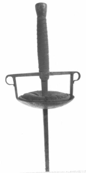 Fornimento in acciaio con pomo tronco conico, manico in legno a sezione circolare variabile con manica di striscioline di pelle spiralate destrogire separate da treccioline e cordelline di filo di rame, scudetto inciso con motivo floreale, gavigliano unito alla coccia mediante due fermi verticali e sui quali terminano i due prolungamenti del gavigliano chiusi ad anello, coccia decorata in morsura con imbottitura, lama piatta al ricasso, si restringe fino ad assumere una sezione quadrata finita a bottone.