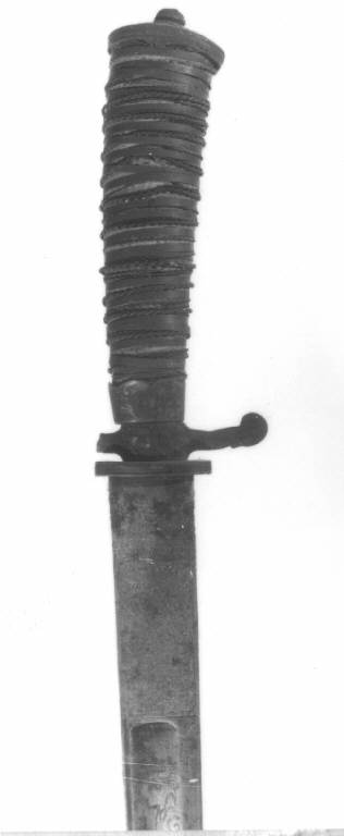 Impugnatura in legno, a sezione ovata, leggermente ricurva e allargantesi verso l'alto; ricoperta da una lamina d'argento in strisce alternate a treccioline di filo d'argento, sagomata con decoro inciso, ghiera in argento decorata a sbalzo con motivi fitomorfi e un lupo, blocchetto in argento inciso a fogliami con un leone, al centro, da una parte e un orso dall'altra, brevi bracci, spinti uno in basso (spezzato) e uno in alto, terminanti a bottone, piccola protezione ovata e profilata, in lamina d'argento, a cappetta, lama non pertinente, diritta a filo e costola, liscia al forte con decorazione a intrecci geometrici su fondo dorato e tabella con iscrizione, dal medio alla punta sgusciatura con alcuni animali di agemina d'oro.