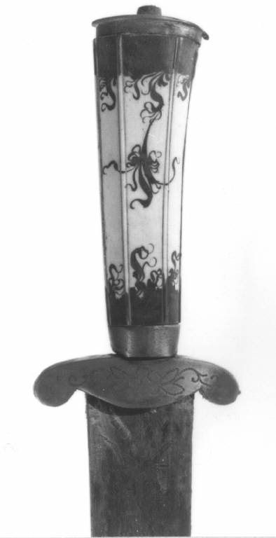 Impugnatura di corno a sezione esagonale irregolare scantonata, leggermente ricurva e allargantesi verso l'alto, lavorata a cordoncini rilevati sugli spigoli e dipinta a finto intarsio con nastri vegetali,due mezze olive in ottone su una faccia, cappetta sagomata con anellino per il passaggio della cordicella, sormontata da bottone entro cui è ribattuto il codolo, ghiera liscia in basso, blocchetto terminante ai lati in due dischi con decorazione floreale e punteruoli in protomi canine, lama poco ricurva a un filo e costola, con ampia sgusciatura ai piatti, sul dorso, per tutto lo sviluppo del forte, presenta un'incisione con una lunga freccia, al forte incisione con trofei, stelline e cifre, fodero in pelle nera con cappa e puntale in ottone decorati su un lato con incisioni e scudo, anellino con cappa.