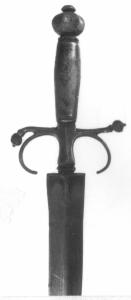 Fornimento composito con riutilizzo di spadino settecentesco e impugnatura ottocentesca, pomo sferoidale a sei facce con bottone e basettina, blocchetto allungato con brevi bracci spinti uno in basso e uno in alto, terminanti in forma di urnetta con apice, archetti sviluppati in tre quarti, lama non pertinente (settecentesca) al tallone e rifilata al debole in sezione romboidale.