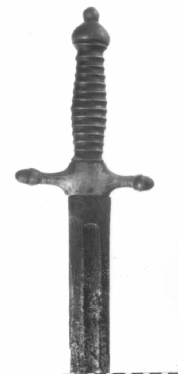 Fornimento in ottone in un sol pezzo, impugnatura solcata orizzontalmente, pomo sferoidale con vistoso bottone sul quale è ribattuto il codolo, crocera con al centro in rilievo la croce sabauda, rami diritti terminanti a forma di ghiande, lama a due fili con sgusciatura fino al debole, punta tronca.