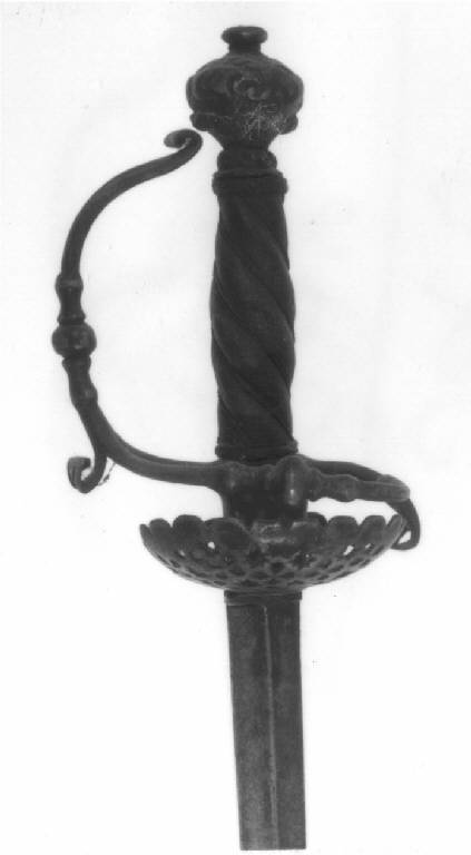 Pomo a fico intagliato, a foglie, con bottone e basettina, impugnatura a fuso, con camicia di pelle, dai rigonfi spiralati destrogiri accompagnati da treccioline in filo di ferro; piccole teste di moro, guardia semiellittica finita a ricciolo con ovulo e rigrossi al colmo, in basso si stacca un altro ricciolo voltato verso l'esterno e un ramo scorrente al di sopra della tazza, con identico ovulo e rigrossi al colmo, terminante nel braccio di parata, braccio di parata rivolto in basso e finito a ricciolo, dallo scudetto si diramano gli archetti, fissati a vite alla tazza a doppia valva, asimmetrica, a giorno, lama costolata a sezione di losanga con tallone sodo.