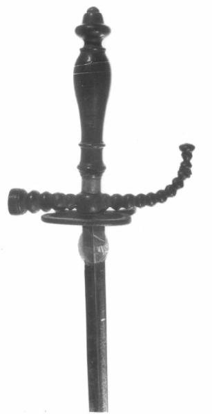 Impugnatura di legno tornito a balaustro con bottoncino in acciaio e ghiera in ottone, elso gettato in acciaio, a ovuli di diverse dimensioni, terminante in blocco cilindrico, con calotta e rialzato, su un lato, a come guardia, due anelli simmetrici a sezione quadrata al di sotto dell'elso agevolano la presa, lama a sezione triangolare, sgusciata su un piatto e con costolatura rialzata sull'altro.