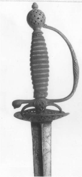 Spadino alla Konisberg (Frantopino), fornimento a giorno con pomo sferoide con bottone e basettina, impugnatura a sezione rettangolare con manica destrogira a listelli, cordelline e treccioline con una testa di moro in rame, guardia poco ricolma fissa al pomo, braccio di parata bulbato, blocchetto poco rigonfio, archetti, doppia valva simmetrica, pomo a giorno con fregio nastriforme e fiorellini, blocchetto, guardia e bulbo di parata presentano toccature con fogliami appena rilevati, coccia a doppia valva (una mancante di un lobo) a giorno, a fogliami, riparo in velluto, lama a sezione triangolare sgusciata, costolata da un lato, incisa al forte con spartito sormontato da decori floreali in morsura e continuata in verduco.