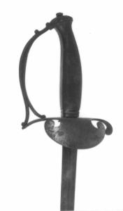 Fornimento in acciaio, impugnatura a sezione rettangolare rastremata verso l'alto e terminante in un cappellotto a ombrello bottonato, guardia poco arcuata a sezione rettangolare variabile terminante in alto con due denti distanziati, fissata all'impugnatura biforcuta con due rami finiti a ricciolo e terminanti nel braccio di guardia leggermente curvato in basso, breve braccio di parata con rigrosso terminale a ricciolo e spinto in basso, difesa a pelta ribassata liscia con incisa l'aquila asburgica a due teste, frammenti del riparo in pelle tra il fornimento e la lama, lama lenticolare con tallone scantonato e resti di decoro vegetale al fronte.