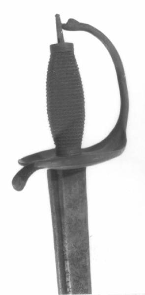 Fornimento mancante del pomo, impugnatura a fuso di sezione variabile con manica di treccioline tra ghiere, la coccia è a forma di lira, a due lobi leggermente concavi, terminante, da un lato, nella guardia che sale al pomo con rigrosso e, dall'altro, in un breve braccio di parata spinto in basso e bulbato, poco ricurva a un filo e punta con canale sotto la costola che si restringe progressivamente fino alla punta liscia, incisioni al forte decori floreali da un lato e croce sabauda dall'altro.