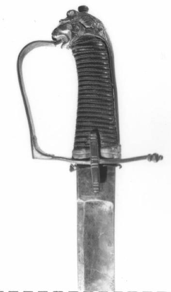 Fornimento in ferro dorato, guardia monoelsa con parte montante sagomata, cappetta lunga terminante in una protome leonina nelle cui fauci si incastra la guardia, impugnatura in legno, spiralata, ricoperta in pelle con treccioline di filo di rame fermate in basso da ghiera, alette a barretta incise a solchi paralleli e riparo in velluto, lama ricurva a un filo, punta e controfilo, con tallone sodo sgusciato.