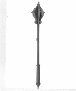 Testa con sette coste modanate e con puntale tornito, manico tubolare liscio, con due fori per il cappio poco sotto il nodo che chiude l'impugnatura la quale, in basso, termina con un nodo, piccola cuspide e campanella pendente, impugnatura liscia.