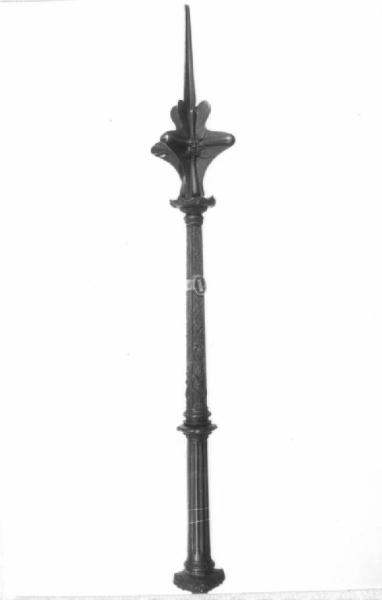 Testa di quattro coste modanate con cuspidi fortemente broccate e costolate, al centro di ogni coppia è un mascherone in bassorilievo, puntale al sommo fortemente allungato e appuntito, ha collarino a corolla che poi si allarga e si rialza a calice con becchi, fusto a quattro liste incise a viticci, impugnatura scanalata a formare una colonna che termina in alto e in basso in due nodi, zoccolo parallelepipedo scantonato, calotta e apice incisi.
