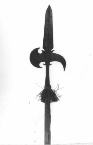Gorbia in tronco di piramide a sezione ottagonale con bandelle, terminante, in alto, con due cuspidi incurvate verso l'alto, scure a filo convesso, quasi in semicerchio, con margini concavi, becco appuntato e rivolto in basso, due cuspidi rivolte in alto, larga lama dai fili poco obliqui, sagomata a triangolo in basso e alla punta, percorsa da nervatura, asta ottocentesca a sezione ottagonale e nappa.