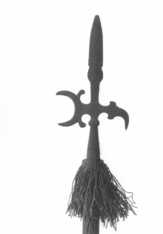 Gorbia in tronco di cono con bandelle, decorata con toccature ad anelli, spiralata destrogira, sormontata da nodo sferico schiacciato, il ferro riunisce scure, becco e cuspide mediante un elemento comune, piatto e in forma di croce con quattro incavi in arco di cerchio, scure lunata con gobbe stondate e rivolte indietro, becco di parrocchetto in forma di proboscide elefantina stilizzata, ripiegato fortemente, con gobbe allo stacco dal ferro, cuspide sagomata con una cornicetta con allargamento ellittico e foglia lanceolata a sezione lenticolare , tutto il ferro è decorato a incisioni e toccature, asta ottocentesca a sezione ottagonale e nappa.
