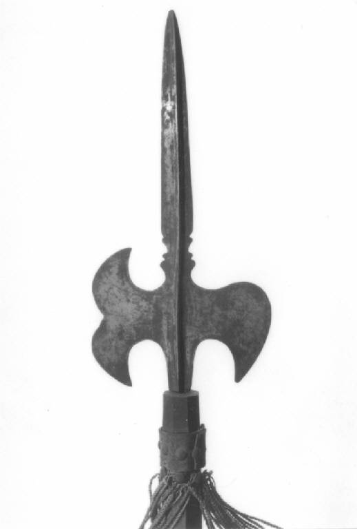 Prisma ottagonale entro cui è avvitato il ferro che sale fortemente nervato fino alla cuspide, scure a filo due volte convesso, in forma speculare, becco breve molto allargato e gibboso, piegato fortemente, cuspide sagomata a sezione lenticolare con forte nervatura fino alla punta consumata, asta moderna a sezione ottagonale, fascetta in pelle a stringere il prisma di congiunzione con legno e nappa.