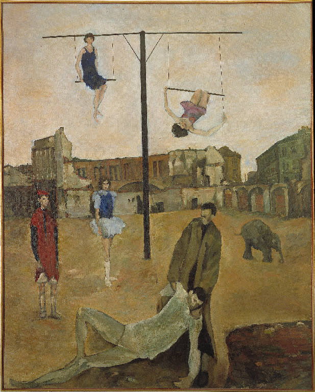 - NOTIZIE STORICO CRITICHE Le vedute di quartieri periferici e popolari di Milano ricorrevano nella produzione grafica e pittorica di Treccani nei primi anni '50: quando "la visione urbana si incontra con la visione favolosa dell'infanzia ne viene fuori una tela come Arlecchinata a Porta Volta, in cui il mito infantile del circo si unisce alla presenza della città devastata dall'ultima guerra" (De Micheli). L'immagine risulta dalla condensazione sulla tela di una quantità di motivi, temi, ricordi legati a esperienze esistenziali e visive diverse: l'impianto complessivo sottolinea l'impressione suscitata in Treccani della Crocefissione di Signorelli, vista agli Uffizi; ma c'è il ricordo di Luci della ribalta di Chaplin e di un più contingente fatto di cronaca, la caduta di un acrobata in un piccolo circo di periferia. Due giovani scultori - Alik Cavaliere e Sangregorio - sono stati i modelli dei personaggi di primopiano, osservati dai due figli dell'artista. Già nella collezione Feltrinelli, collocato nella libreria Feltrinelli di Firenze, fu riacquistato dall'autore dopo l'alluvione del 1966. Un cartone dipinto all'acquerello, di uguali dimensioni è conservato al Museo di Bagnacavallo.