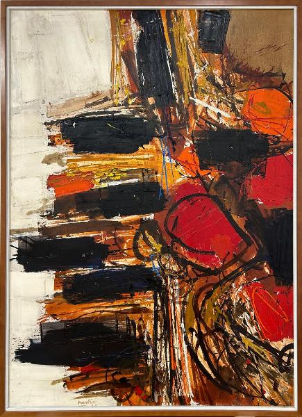 Composizione astratta-informale, fondo bianco e ocra, campiture e segni nei toni del nero, rosso, arancio, giallo.
