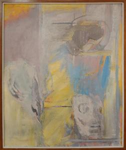 Veduta d'interno in composizione ascrivibile all'ambito del Realismo esistenziale, con influenze segniche ed espressionistiche e dai colori dissonanti e antinaturalistici. Si indovinano forme di maschere e di un uccello a testa in giù.