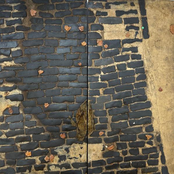 Ricreazione realistica di porzione di selciato della città di Londra, realizzata con la tecnica del calco in vetroresina montato su due telai accostati a dittico. L'effetto realistico è rinforzato dall'applicazione di oggetti trovati in loco, tra cui una tela, delle foglie secche, un tappo di bottiglia.