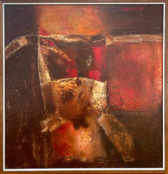 Composizione neoespressionista-astratta realizzata con varie velature di cere e pigmenti su tela. I toni sono bruni e rossi accesi dall'effetto drammatico e suggeriscono forme scomposte quasi umane.