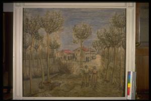 Paesaggio con pioppi, figure e ruscello. PAESAGGIO CON ALBERI