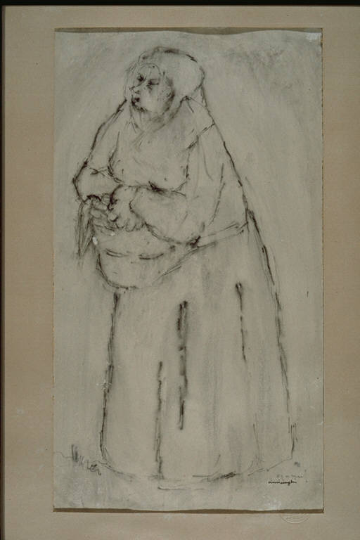 Contadina bergamasca. Figura femminile stante, velata, con il grembiule raccolto in grembo, a mò di cesta