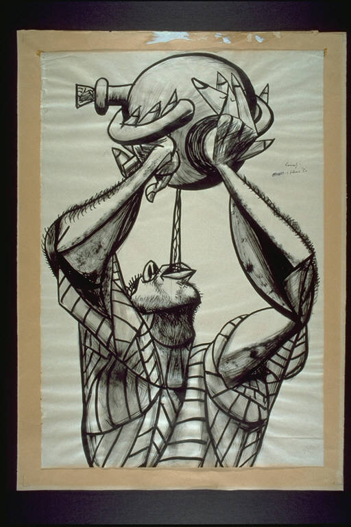 - NOTIZIE STORICO CRITICHE L'opera fu premiata al III Premio Suzzara (1950) con kg. 9 di salumi.\nIl tratto è incisivo ed angoloso, e mostra una tendenza alla deformazione espressionistica della figura umana. questo stile risulta, probabilmente, da una lettura personale del cubismo e di certa grafica espressionista.\nL'artista è nato a Mascalucia (Catania) nel 1919. Compiuti gli studi classici, s'è laureato in Lettere, specializzandosi quindi in Discipline archeologiche e storico artistiche. Dopo essere rientrato in Italia dalla prigionia in Germania, espone nel 1948 alla Quadriennale di Roma e si trapianta in Abruzzo, a Chieti, dove si dedica alla ceramica e alla terracotta, pur non tralasciando la pittura. Allestisce la sua prima personale a Chieti , nel 1950. Nello stesso anno e poi anche nel 1951 è tra gli artisti premiati a Suzzara. Nel novembre del 1952 ha luogo a Catania la prima antologica della sua attività. Espone per la prima volta a Milano nel 1956, alla Galleria Apollinaire. Si insedia a Genova, dedicandosi alla scultura in ferro saldato all'arco elettrico. Espone a Buenos Aires. Dal 1974 modifica radicalmente il criterio della sua pittura. Costruisce le figure in arancione su fondo nero, con varianti cromatiche di verde, azzurro e violetto con accensioni di rosso e giallo e grigi variegati di finissima sensibilità.